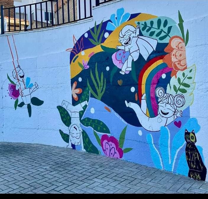 Proyecto mural realizado junto a alumnado local. Propuesta colorista con enfoque educativo y comunitario.
